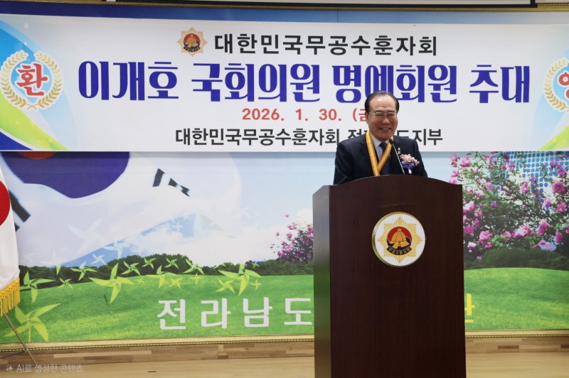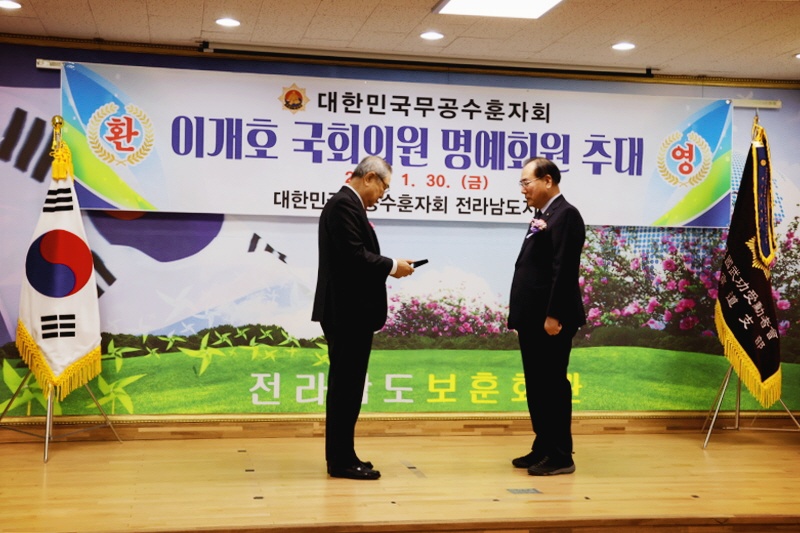 26년 01월 30일 오전10시 30분, 전남 보훈회관 4층 대회의실에서 대한민국무공수훈자회 약 60여명의 회원이 참석한 가운데 이개호 국회의원을 대한민국 무공수훈자회 명예회원으로 추대하는 행사를 진행함.