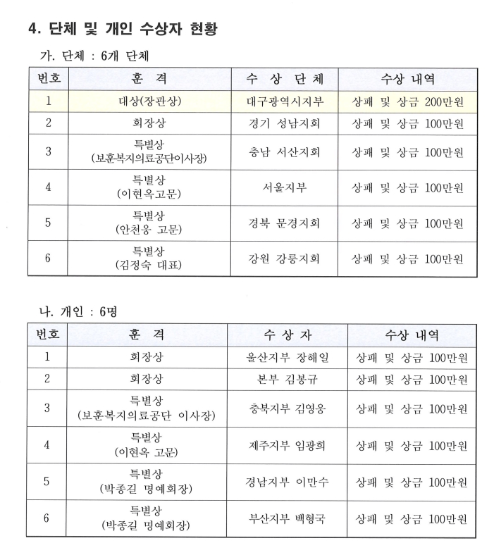 대구시지부가 대상을 차지해 국가보훈부장관상을 받았고 모두 12개 단체 및 개인이 영예의 상장 및 상금을 수상했다.