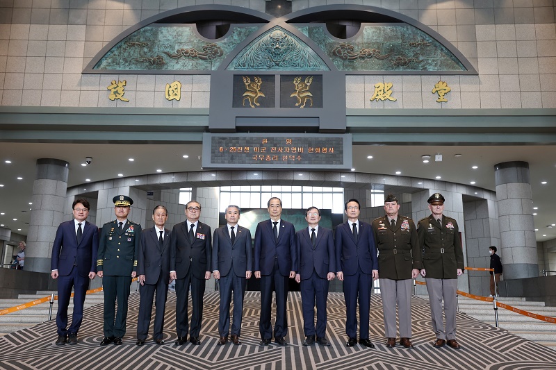 한 총리는 이종섭 국방부 장관과 윌러드 벌러슨 미8군사령관 등과 함께 전쟁기념관을 방문했다. 백승주 전쟁기념사업회장, 안병석 한미연합사령부 부사령관과 박운욱 재일학도의용군동지회장, 김정규 무공수훈자회장 등 참전·보훈 단체 대표도 동행했다.