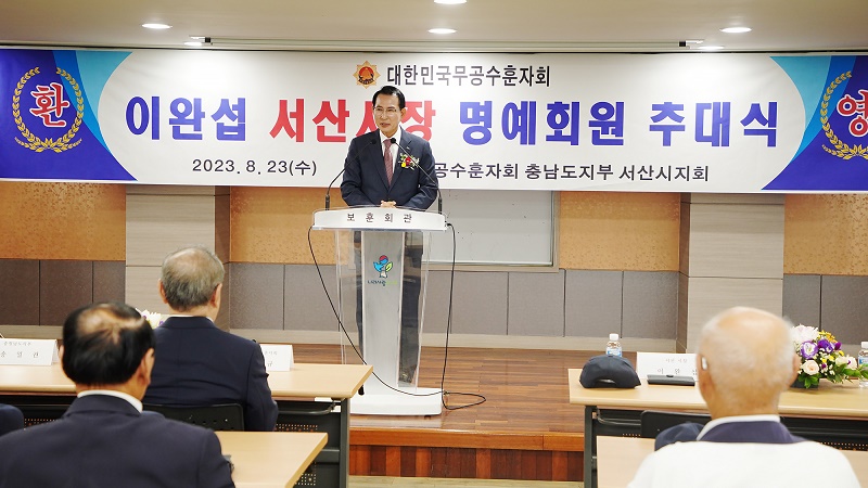 2023.8.24(목) 대한민국무공수훈자회 김정규회장과 충남지부장, 서산시장, 서산시회원들이 참석한 가운데 서산보훈회관에서 이완섭서산시장 명예회원 추대식이 열렸다. 이날 명예회원으로 추대된 이완섭 서산시장은 무공수훈자회 선양사업을 앞으로도 적극적으로 지원하겠다며 국가유공자 예우증진을 위한 무공수훈자회 회원들의 노고에 감사를 표했다.