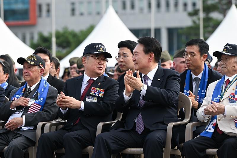윤 대통령은 이날 서울 용산 전쟁기념관 평화의 광장에서 열린 행사에서 “중공군의 대규모 공세를 저지한 장진호 전투 등 6·25전쟁에서 피로 맺어진 한미동맹은 지난 70년간 전 세계에서 가장 성공적인 동맹으로 발전해 왔다”며 이같이 말했다. 이어 “장진호 전투는 다 아시다시피 미 해병 제1사단이 주축이 된 유엔군 3만 명과 12만 명의 중공군 간에 이루어진 치열한 전투”라며 “이 전투를 통해 중공군의 남하를 저지할 수 있었다”고 설명했다. 윤 대통령은 김응선 옹(102)과 켄림 힌쇼 모이 옹(92) 등 한미 6·25전쟁 참전용사들과 함께 기념식장에 입장했다.